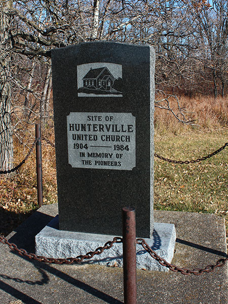 One of two monuments at this site, alongside Highway 10 in the Rural Municipality of Minto-Odanah, marks the former site of the Hunterville United Church. Named Hunterville in recognition of Mrs. W. Hunter, who donated an acre of land on which the church building was erected, its first service was held in October 1904, prior to which they had been held in the former Tremaine School schoolhouse in affiliation with the Presbyterian Church of Rapid City. In 1925, Hunterville became part of the newly formed United Church of Canada. The final service was held on 27 June 1993. Three years later, the former church building was moved to its present location at the Minnedosa and District Museum.