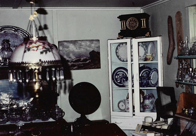 Let's have a short run-down of a few of the items each building contains; The Glass House houses a collection of glassware from cup glass to Depression glass; china - from Ironstone (remember the large white soup plates you ate your hot porridge from each morning?) to fine English and European china; lamps - many models and sizes, including a beautiful hanging lamp complete with hand-painted shade and crystal drops; bathroom sets (mostly missing the mug that went under the bed, guess it got the most practical use); gramophones with both cylinder and 1/4 inch thick discs; stereoscopes and cards; and photograph and postcard albums. Our lady visitors seem to like the Glass House more than the other buildings. ![]() ![]() The Library & Smoke Shop Next in line is the library and Smoke shop. Here we have modem books as well as old, dog-eared volumes. Our oldest book is a huge Bible with an inscription on the cover showing it was given as a gift in 1756. It is written in the German language. Here also is a conglomerate of newspapers, news-magazines, farm journals, and craft magazines. There is a "Grain Growers Guide", September 10th, 1919, Volume XII, No. 37, publjshed weekly with George F. Chipnan, Editor and Manager, which has a page of Arch Dale's "Doo Dads". There is also "True Story" magazine, October; 1925, Volume XIII, No. 3, published monthly by True Story Publishing Company, New York, New York. It has proven to be a real eye-catcher. There's many a gal who remembers avidly reading "True Story" and hiding it quickly under a pillow when Mom and Dad approached. The Smoke Shop consists of tins, cans, and humidors that once contained that evil weed called tobacco. One tin has the price ten cents stamped on it. Imagine! ![]() Also displayed here are articles pertaining to tobacco - pipes, tobacco cutters, cigar lighter and other numerous articles. A guest book in this building shows visitors' names from many places in Canada, Great Britain, and the United States. The General Store Let's move on to the General Store, On the way we pass a C. P. R. baggage wagon on which proudly stands a large brass school bell purchased at Gainsborough, Saskatchewan; as well as a feed cooker or pig scalder and a wooden-wheeled child's wagon. Outside the store, a hand-wound barber pole is placed on the wall. Inside are many articles that were found in most country stores, haberdashery shops, and hardware stores. There is also a wooden apple-barrel from Ontario with a checkerboard tacked on the lid, as well as a "Whatzit". What it is, is a large, cumbersome butter roller standing on 24 inch legs, It was put out by the T. Eaton Company about 1917. There is, of course, a large pot-bellied stove in the General Store. ![]() Robinville School Now we are going to Robinville School which is the former country school in our neighbouring district. In here we have a varied collection of sealers such as Beaver, Canadian Queen, Doolittle, and Mason, as well as bottles. It's a real find to come across an embossed bottle bearing the name and address of a chemist or druggist, or an old pop bottle whose manufacturer has long been outof existence, a Raleigh's peddler's carrying case of 1921 with many full bottles and tins, sits on a table. Besides it is an electric refrigerator with the cooling unit on the outside on top of the refrigerator. Shelves inside the classroom are lined with old and new school books such as a sot of Canadian Readers, published by Gage and Company, Toronto, dating from 1881 to 1883, and a set of Victorian Readers, published by Copp, Clark Company and W.G, Gage Company Limited, Toronto, dated 1898, There are also map cases, chalk boxes, slates and slate pencils, and four heavy ledgers containing accounts of Christie's School Supply Limited, Brandon, Manitoba. These ledgers show the company dealings with schools all over Western Canada and Ontario. These are accounts of the years 1910 to 1916. We had hoped to set this building up as an old-time classroom, however, because it is a fairly large building and our collection is also fairly large, the additional space was used to display radios, cameras, harnesses, Indian artifacts, and war-time mementos. ![]() Pendennis Station From Robinville we walk to Pendennis Station. This contains railroad lanterns, brochures for travelling by rail or steamer, mail sacks and locks, and a long pole with a hoop on one end used to pick up messages without stopping the train. Here also we see a large collection of wrenches. Many an old-timer reminisces here while: displaying a badly- bent finger or a hand missing a finger and pointing to the wrench that did it to him. Also on display are license plates (still with one or two missing to complete the set), tools, keys, washing machines and a string of brass harness bells, each one with its own distinctive ring and tone. ![]()