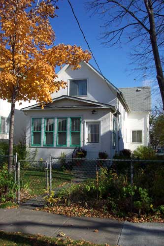 This large 2,300-square-foot house with twelve rooms, probably built as a rooming house, has unique arches on porch and flat top gables.