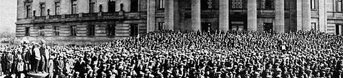 Gradually the trickle of sad stories became a flood; ‘left wing’ Councillors from immigrant wards were being “besieged” by people under order of deportation. [34] In June the issue became a public concern as over 1,000 people marched on the Winnipeg office of the Department of Immigration [35] in a demonstration organized by the Canadian Labour Defence League, the Neighbourhood Council Movement, the Unemployed Ex-servicemen’s Association, and the Committee of the Single Unemployed. The group protested the City’s practice of forcing unemployed immigrants to sign voluntary deportation requests before granting them relief, and demanded the Department put an end to this practice. [36]