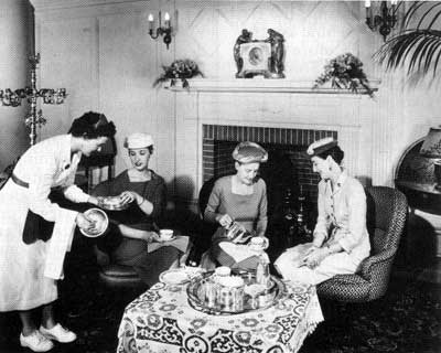With the main meal increasingly postponed till the evening return of the head of the house, women relieved their now enforced and solitary domestication with luncheon, elevated from a furtive snack to a fashionable innovation by the 1820s. To appease their children, they devised afternoon tea sometime in the 1860s. Although, in Palmer’s words, luncheon secured “the nineteenth century’s great gift to man-kind, the afternoon,” men locked in battle of commerce despised the usurper till the turn of the century, restricting their mid-day refreshment to a biscuit and glass of sherry; the first sightings of today’s replete business lunch came only in the 1920s. But the rise of lunch had already reinforced the sexual division of the day into two forms a good point — though here Palmer’s formulation becomes uncharacteristically frisky. Victorian men took their hasty refreshment standing up; their wives did otherwise, stretching lunchtime dalliance into afternoon adultery. (But with whom, the tidy-minded will demand, if all the men were at the counting house?) The social function of afternoon tea, understandably enough, was gossip.