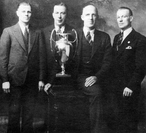 Ab Gowanlock’s Glenboro Curling Club rink, Brier champions in 1938. Left to right, W. D. McKnight, second, “Bung” Cartmell, third, Ab Gowanlock, skip, E. R. “Tommy” McKnight, lead.