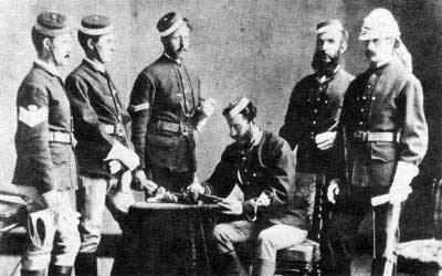 A group of North West Mounted Police in 1874. Francis Dickens is standing second from right.