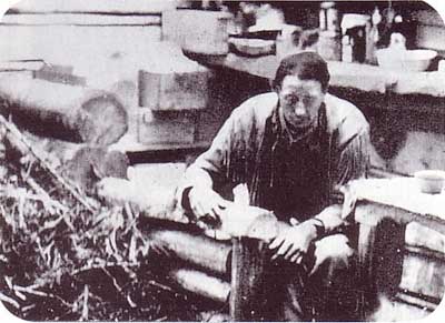 Grey Owl in his cabin on Ajawaan Lake, Prince Albert National Park.