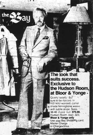 If a man wanted to be taken seriously in the business community he dressed the part. Retailers such as the Bay (as shown in the accompanying advertisement from the period) promoted this attitude, using carefully chosen words that connected “success” with appropriate business dress. This constituted dark colours and classic simplicity in the styling of the suit and as the newspaper writer Mardon noted in 1977, the presentation was completed by leaving the bottom but-ton of the vest undone. The ‘look’ was understated and definitely not frivolous. You might venture to say this was typical Canadian business attire with its historical roots in, the somber and conservative British appearance.