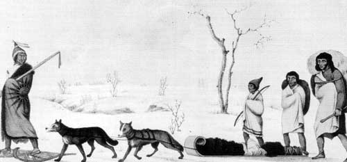 “A Souteaux Indian, travelling with his family in winter near Lake Winnipeg.” Watercolour by Peter Rindisbacher, 1823.