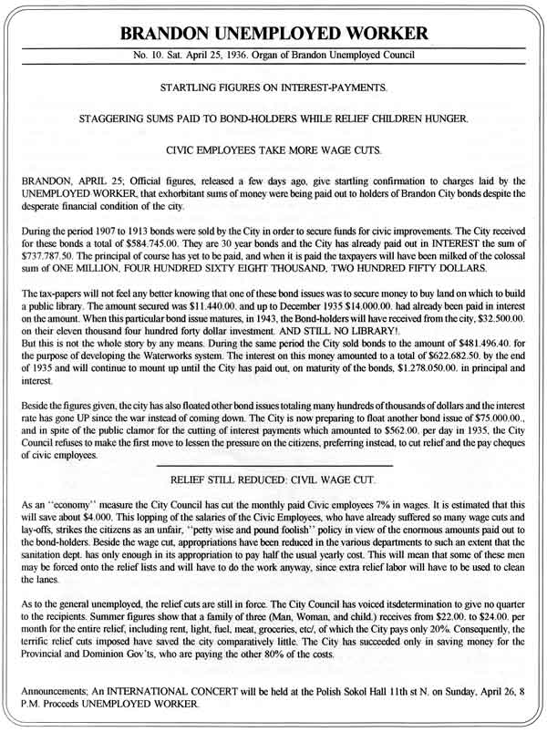 In 1931 the Brandon Unemployed Council was created in Brandon. [1] Led by local members of the Communist Party, it was designed to organize and to assist the growing numbers of jobless workers in the city. Throughout the thirties it was a highly visible and active organization. By the middle of the decade two thousand people were estimated to be members of the Council. [2] In December 1935, the Council’s executive committee initiated the publication of a bi-monthly newsletter called the Brandon Unemployed Worker. Designed to compete with the conservative Brandon Daily Sun in shaping the debate on the treatment of the unemployed in Brandon, the Worker appealed to “all citizens who are in favour of granting the most maligned section of the community A Square Deal. [3] Unlike the Sun, which supported the municipal government’s decisions and policies, the Worker criticized various actions of the City Council. The Brandon Unemployed Worker also had an educative and organization function for the unemployed. It provided a forum for the consideration and advocacy of alternative, practical solutions to the economic crisis of the depression.
