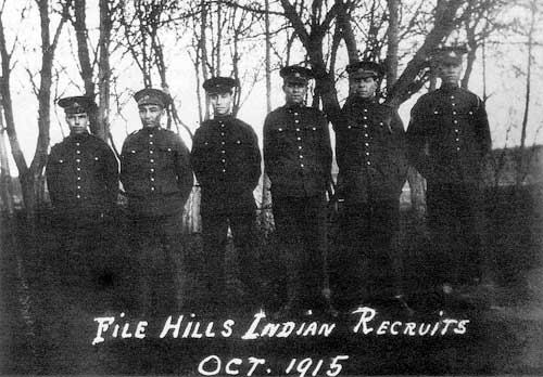 Recruits from File Hills, Saskatchewan, October 1915. Left to right: David Bird, Joe McKay, Leonard Creely, Jack Walker, and Harry Stonechild.