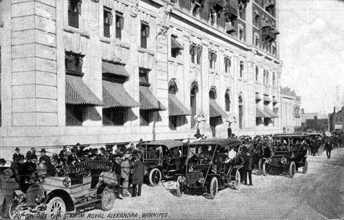 Royal Alexandra Hotel, Winnipeg, circa 1910. Opened in 1906, the Royal Alexandra served as one of the main luxury hotels in the city until its closing in 1967. The hotel was known for its large rotunda, Challenger murals, tea room, Crystal Ball Room, and vice-regal suite. The Royal Alexandra was demolished in 1971.