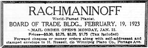 Rachmaninoff never returned to Russia, but in many respects, he never left. The melancholy which informed so much of his music was etched on his face for all to see. He was rarely seen to smile in public, and it was mainly the members of Russian émigré circles who understood his love of a good joke and his wry sense of humour. It was left to another famous Russian musical exile, Igor Stravinsky, to memorably describe Rachmaninoff as “a six foot scowl.” [66] It was as though the composer had taken the burden upon himself to convey to the world that what Russia had been seeking to achieve in those frenetic years before the revolution was of the highest importance and of the greatest dignity. This aspect was noticed by the reviewer of the 1923 Massey Hall concert in Toronto, just prior to the pianist’s first appearance in Winnipeg: “... the first impression of Sergei Rachmaninoff one got when he came upon the platform last night was that he is a tragic figure. [67]