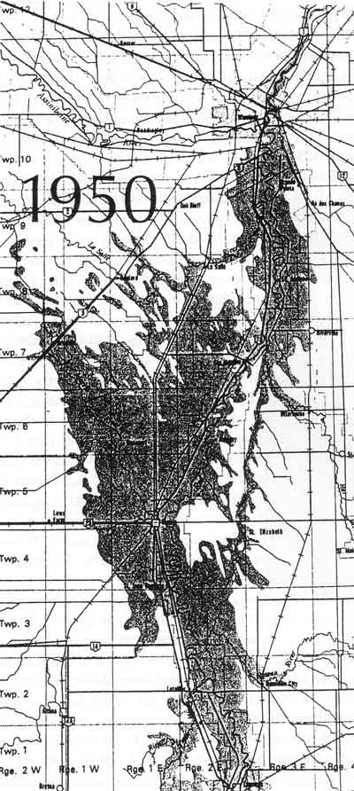 The extent of floodwater in southern Manitoba in 1950.