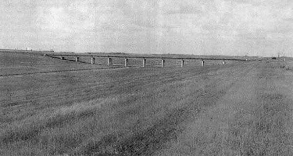 On completion, the Red River Floodway was by far the largest excavation project undertaken in Canada to that date, and one of the largest man-made channels anywhere. The volume of material excavated in constructing the floodway was close to 40% of the total excavated in constructing the Panama Canal, and exceeded slightly the total volume of material dredged and excavated in cutting the original Suez Canal channel. [28] The 100 million cubic yards of excavation for the floodway also exceeded by 36% the total amount of material excavated and dredged in building the Canadian section of the St. Lawrence Seaway. [29] Moreover, the Red River Floodway excavation dwarfed one of Canada’s hitherto largest earth-moving construction projects, the South Saskatchewan River Dam project (1960-65) which saw over 45 million cubic yards of material moved to construct two earth-fill dams, the South Saskatchewan River Dam (210 feet height, 16,700 feet crest length) and the Qu’Appelle Valley Dam (90 feet height, 9,000 feet crest length), to form an 8 million acre-foot water reservoir. [30]
