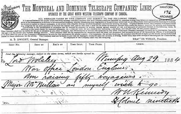 Kennedy’s telegram to Wolseley about the Manitoba voyageurs, August, 1884.