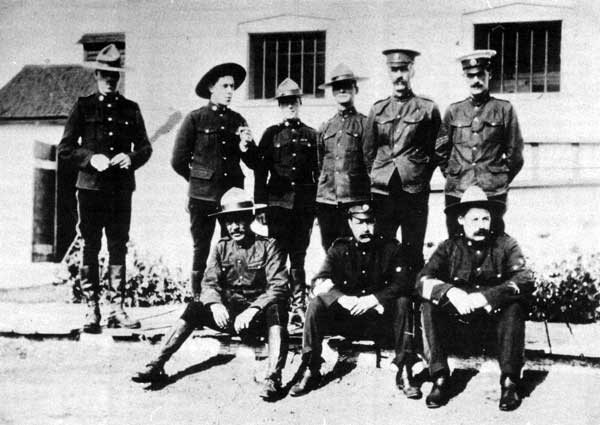 NWMP posing in front of the Guardhouse at Fort Battleford, circa 1912.