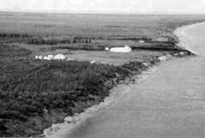 The front of the Depot building. The Depot is about 93 metres from the bank of the Hayes River. The bank erodes from 1 metre per year to 3 metres every 5 years. There are archaeological features between the Depot and the river.
