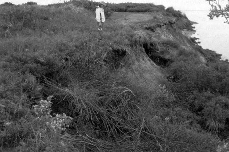 Wave action is the main cause of riverbank erosion at York Factory. Ice scouring and permafrost contribute to the erosion. A 19th century icehouse is eroded here.