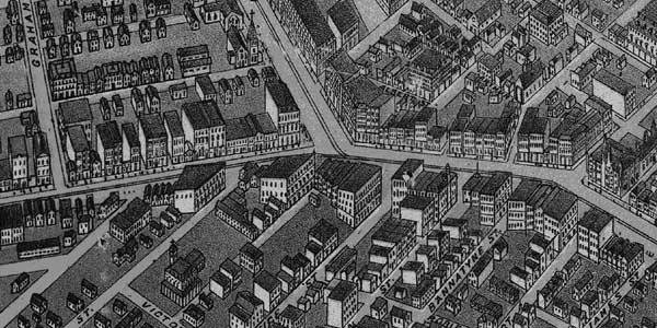 The intersection of Queen Street (aka Portage Avenue) and Main Street, from W. G. Fonseca’s 1874 Bird’s Eye View of Winnipeg, is available in digital form on the US Library of Congress web site.