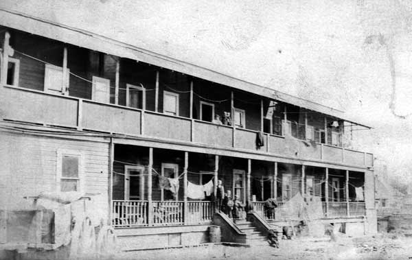 Tenement House on Grove Street, north of the CPR depot, 1909. Each door and window represents the home of one family. (The image is a double exposure. Can you see the very faint faces of three women?)