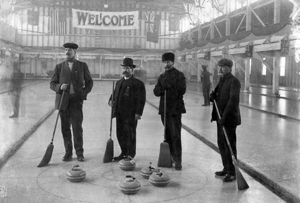 Reverend Charles W. Gordon (aka Ralph Connor, second from right) enjoys a game of curling with fellow clergymen (L-R) J. W. McMillan, J. C. Walker, and C. McKinnon.