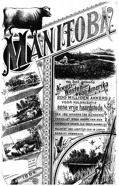A Canadian immigration poster from 1884 promised Dutch immigrants to Manitoba such delightful pastimes as buffalo hunting, deer shooting, and salmon fishing.