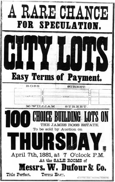 The general plan on which these syndicates worked was perfectly simple. Several men with capital would combine and purchase a lot running back perhaps two miles from the Assiniboine or Red River, with a width of fortyfour, or six chains frontage on the stream. A plan was at once made, which showed an odd park or two, with beautifully laid out streets bearing, as a rule, every name given to the fair sex within modern times. This plan was lithographed, if there was sufficient time, and at once the “syndicate” was ready for business. Each member made it his object to frequent, for a day or two, the habitual haunts of the speculative crowd, extolling the advantages to be gained by the first purchasers of the lots in question, and soon all eyes were turned to No. — St. James, No. — St. Johns, or No. — Kildonan, as the case might be. After a vast expenditure of printers’ ink, the syndicate placed the plans in an auctioneer’s hands for the sale, usually taking care to mark off a few lots, “which by particular request had been sold at private sale.” People rushed to buy the lots, and after one or two nights’ auctions the owners of the main property sold out their interest in the remainder for a lump sum.