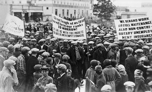 Unemployed workers and their families demonstrate outside Winnipeg’s City Hall, 1930s.