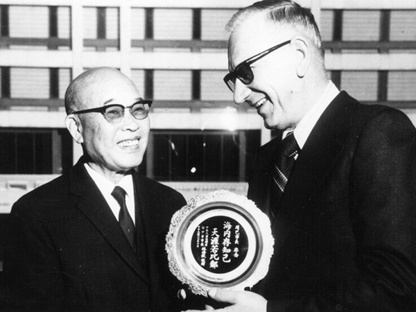 Charlie Foo (left) and Steve Juba inspect a commemorative plate for the twinning of Winnipeg and Taichung, Taiwan in 1971.
