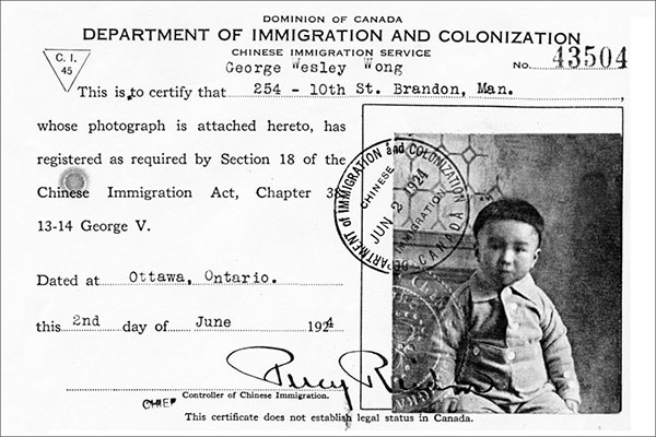 For much of Canada’s early history, only the very rich male family members (or those with wealthy relatives or work contracts) could afford the ocean liner fare and the $50 head tax required to be paid by all Chinese immigrants upon entry to Canada under section four of the Chinese Immigration Act of 1885. Most wives and children, therefore, remained in southern China while brothers, fathers, grandfathers and uncles worked here and sent remittances home. In 1900, the tax was doubled to $100, and by 1903, it stood at $500. [5] Immigration was effectively stopped from 1923 to 1947 when the final version of the Chinese Immigration Act excluded all immigrants except merchants, students, and diplomats and their staff. [6] After 1923, all people in Canada of Chinese descent whether they were born here or not were required to register with the federal government within twelve months. Failure to comply would result in a fine of up to $500 and/or imprisonment of up to a year. The boy in the Chinese Registration Certificate shown above was born in Brandon. He graduated from Brandon University, became Professor of Physics, and later Vice President (Academic) of Brandon University. [7]