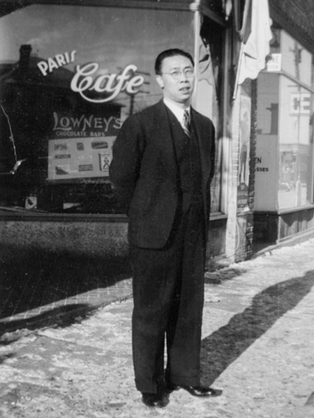 Choy Soo in front of the Paris Cafe in Newdale, circa 1944.