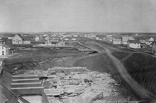 A view of the Point Douglas neighborhood of Winnipeg, looking north from the top of the Court House, August 1875. Foundations for the new city market are visible in the foreground.