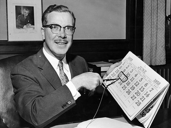 Historic date. Duff Roblin gestures at the dates for the 1958 Manitoba general election, after which he formed a provincial government.