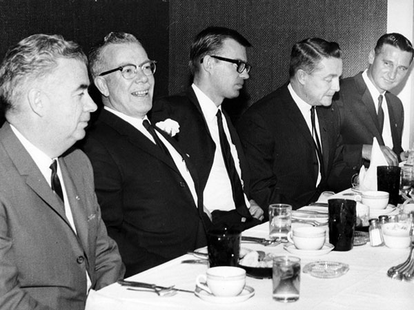 Conservative party. Among those attending Duff Roblin’s 50th birthday party in June 1967 were (left to right) Manitoba PC party president Campbell “Cam” MacLean, Roblin, Roblin friend and aide (and later MHS president) Joseph Martin, newly elected Alberta Premier Peter Lougheed, and Manitoba PC Vice-President Garnet Kyle. Later that year, Roblin would resign as Manitoba Premier and seek the leadership of the federal PC party.