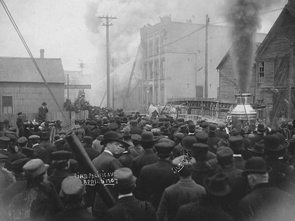 In late morning of 6 April 1907, fire broke out on the second floor of a warehouse on Pacific Avenue belonging to the Montreal firm of the James Robertson Hardware Company. Pile of tar paper and oakum caught fire, and billowing clouds of black smoke made it impossible for firefighters to enter the building. So they were forced to stand outside, playing a stream of water on the blaze in hopes of bringing it under control. Donald MacDonald was probably among the firemen from the North Hall at the scene, calmly standing beside his engine (right) that belched smoke as it pumped water through the hoses held by the men at the centre of this view. A newspaper reporter at the scene estimated that some 5,000 people watched the firemen in their futile efforts. In the end, the building was a total loss, and the business manager estimated his losses at between $100,000 and $150,000.