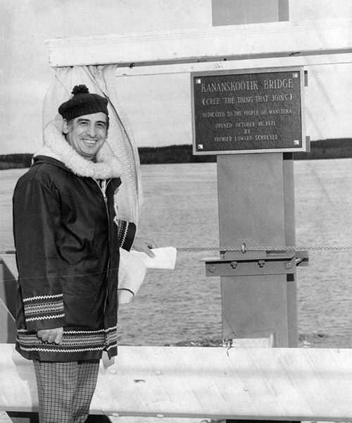 Sid Green, Manitoba Minister of Mines and Natural Resources, opened a bridge at Leaf Rapids, 1971.