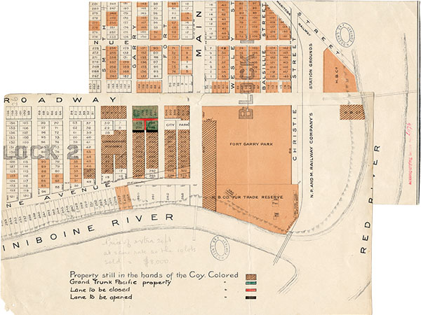 These portions of a larger map show Block One of the HBC Reserve, which was divided into four blocks. Block Two (between Assiniboine, Broadway, Main, and Kennedy) was developed as an upper-class residential neighborhood, whereas Blocks Three and Four (between Broadway, Notre Dame, Main, and Colony Creek) became mixed business-residential areas. Block One, which was plagued by flooding and difficult to develop, became a shantytown in the 1870s. [1]