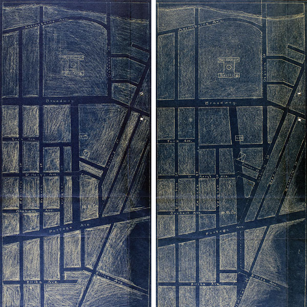 These sketched blueprints show two variations of the Memorial Boulevard approach. The left plan shows a straight mall with the proposed HBC property at the southwest corner of Portage and Memorial. The right plan is an example of the crooked mall with Osborne extending into Colony Street.