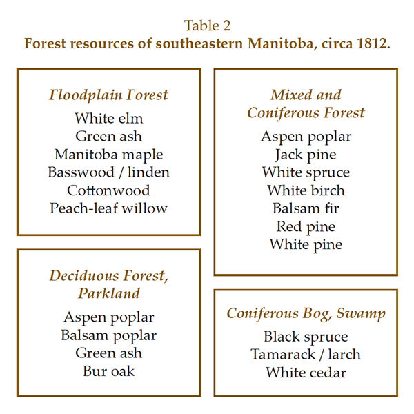 Based on recent forest surveys, the species that bordered the Red and other prairie rivers included white or American elm (Ulmus americana), green ash (Fraxinus pennsylvanica), Manitoba maple (Acer negundo), peachleaf willow (Salix amygdaloides), eastern cottonwood (Populus deltoides), and, in favourable locations, basswood (also known as linden or whitewood, Tilia americana). [12] Stands of bur oak (Quercus macrocarpa) grew on higher ground while islands of trembling aspen (Populus tremuloides) and balsam poplar (Populus balsamifera) dotted the open prairie (see Table 2). River valleys and prairie groves contained limited building timber, so much had to be acquired from distant forests.