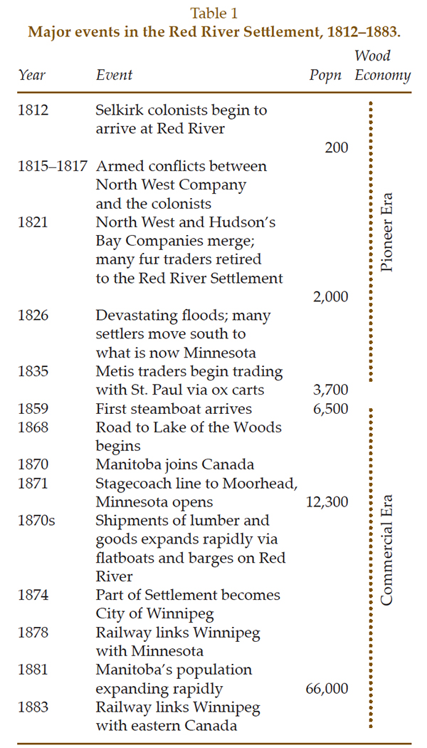 Over seventy years, the wood economy of Red River Settlement shifted dramatically from a “Pioneer Era” (1812–circa 1860s), when families cut most of their own wood for fuel and building, to a “Commercial Era” (1860s–1880s) that saw the expansion of lumber imports, the rise of lumber companies, and the control by the Canadian federal government of timber harvesting.