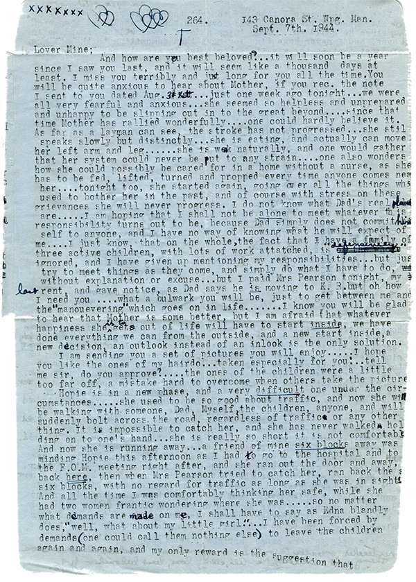 The [letter] regarding your mother’s condition has made me a little anxious regarding your relationship and arrangement at K.R. [the home of Hope’s parents on Kingston Row in St. Vital, where Hope and the children were then living]... I do not think it is wise for you to attempt to care for your mother in her present condition. I realize the difficulty your dad is working under and I suppose it is very difficult to obtain any one to care for one in her condition – but if your mother comes home he will simply have to have someone... I am a little afraid that you are being caught in a pincer movement of your common sense and your emotions. Your dad is in a difficult position and will be inclined to lean more on you than he should. If you try to shoulder the whole load you will only help (I fear) to bring about the collapse of the whole arrangement. [6]