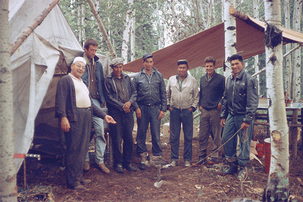 Life in temporary fly camps was seldom dull and often fun. Here cook Pete Wilchovy (far left in the cook tent) admires the crew’s