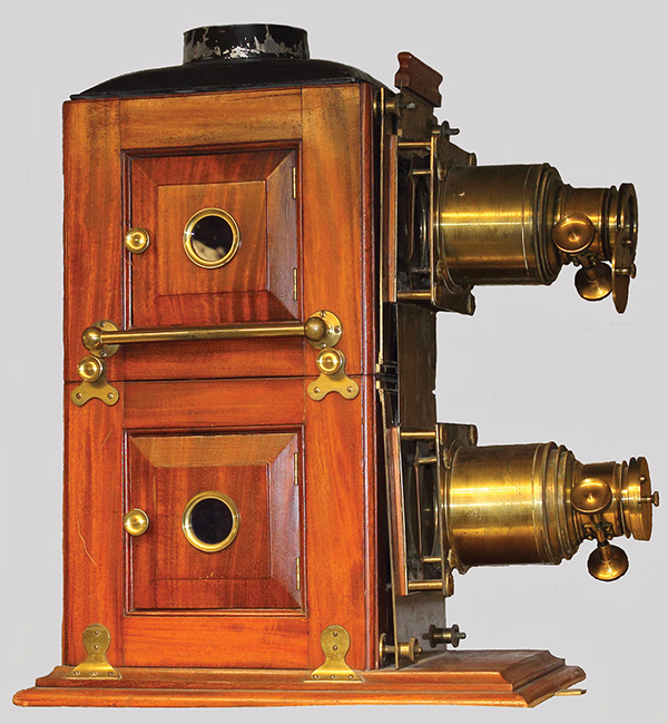 Although the exact origin of the magic lantern is uncertain, what is clear is that the projection of hand painted glass images on walls was already a couple centuries old when the magic lantern became popular in the mid-nineteenth century. The magic lantern was composed of various components: the lantern body, which in later versions was typically a wooden exterior with a metal interior to contain the heat of a light source, a smoke stack to vent smoke and various lenses to guide and sharpen the projected image. Over the history of the magic lantern the light source evolved from candles and kerosene burners, but grew in intensity and projection power, with lime light—an oxygen-enriched calcium pellet that burned bright but dangerously hot, sometimes resulting in fires. The introduction of a bright incandescent bulb brought a degree of safety to the magic lantern shows. To direct the light, on the inner rear side of the lantern body a small concave mirror reflected as much light as possible out a front condensing lens. [4] A horizontal slide guide, mounted on the outside of the lantern body, enabled the lantern slides to be quickly and smoothly introduced into the light stream and likewise changed. Light passed out the condenser lens, through the glass lantern slide and into a projection lens that allowed the image to be focused on a screen 6 to 12 feet away. Although the early magic lanterns were limited to a single projector, later models employed two or three projectors that could be focused on a single spot allowing for a blending from one image to another and special effects.