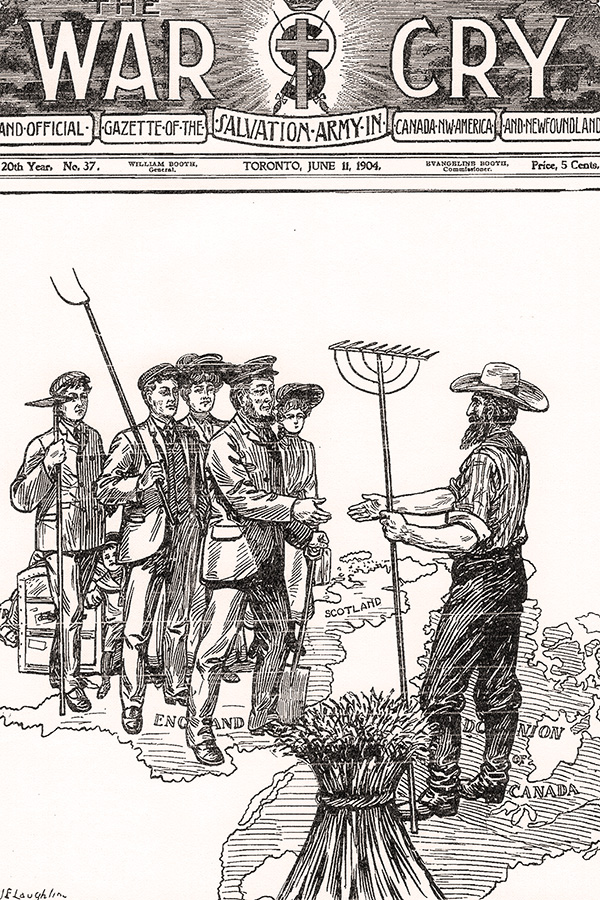 Of those various avenues of Christian outreach most people know—either from personal experience or having read about them. What many Canadians do not now know (though they certainly did in the early part of the last century) was that The Salvation Army was also one of Canada’s leading immigration agencies, accredited and financially-sponsored by the Canadian government. So immense were its immigration services that, between 1905 and 1907, the organization chartered fourteen ocean liners, with a thousand immigrants each, on an alcohol-free trip across the Atlantic. In addition, hundreds of ‘conducted parties’ of between 30 to 300 brought the total by 1914 (before the outbreak of the First World War curtailed immigration) to approximately 50,700 settlers. That number represented fourteen percent of the total who came to Canada in that ten-year period, the Army’s contribution being seven times greater than that of the next most-active agency, the British Dominions Emigration Society. After the War, the Army transported another 65,000 ‘settlers,’ so that by 1932, when its status as an official immigration agency ended, it had helped more than 112,000 British people to make Canada their home.