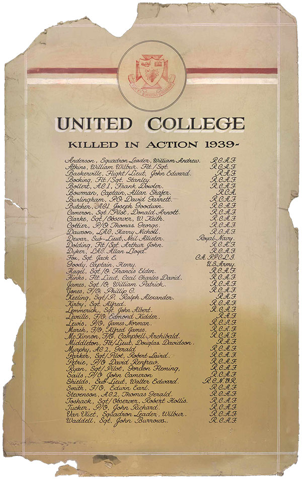 The United College Roll of Honour indicates the College’s continued desire and intentions to remember and memorialize the individuals who served and were killed in the Second World War. The formal roll of honour in the archives’ holdings was created before the end of the war, and lists United College soldiers who were killed in action prior to 1944. Although no amended roll of honour created after the war’s end has been discovered, United College records and reports from the time indicate that an honour roll was updated throughout the war. Former students and graduates of United College who served in the Navy, Army, and Air Force and were decorated, taken prisoner, wounded, or killed in the Second World War were followed, recorded, and memorialized. [13]