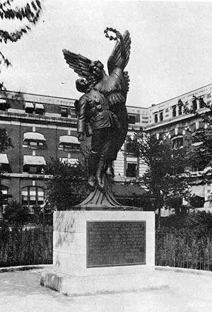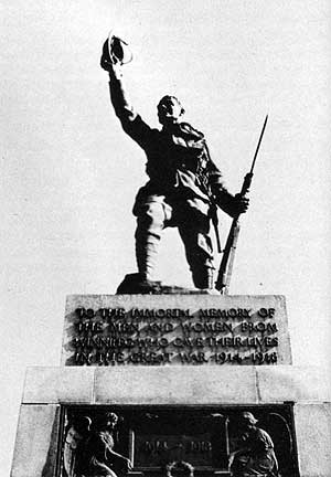 Nor was this monument the only expression of private and particular grief in these years. Private organizations and companies were increasingly producing numerous plaques and monuments: C.P.R., Eaton’s, Alumni of the Manitoba Medical College, the Women’s Canadian Club again, with a plaque for Valour Road, to name but a few. The most notable of this kind of monument was perhaps the Bank of Montreal statue of a World War I soldier erected by bank officials in December 1923 at the corner of Portage and Main in commemoration of employees who had perished in the Great War. [24] The monument was by a sculptor of considerable reputation, James E. Fraser, and it replaced the temporary Cenotaph placed there three years earlier by the Women’s Canadian Club.