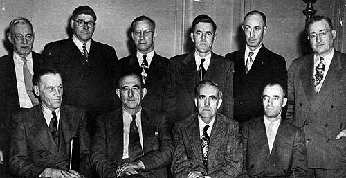 CCIL Board of Directors, 1951. Back - Andy Davie, Dawson Creek, B.C., Ray Coolie, Birtle, Man., Lloyd Acton, Rocanville, Sask., Jim Bentley, Edmonton, Alta., Carl Strayer, Drinkwater, Sask. Front - Jim Cuddy, Sanford, Man., Denis Downing, Saskatoon, Sask., Jock Brown, Winnipeg, Man., Bill Harper, Whisky Gap, Alta.