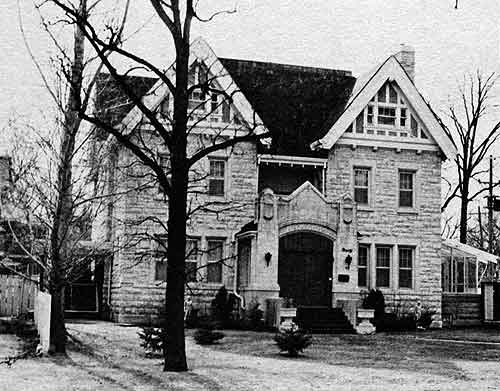 #147, a fair distance ahead and across the street, was built in 1882 for Arthur F. Eden, land commissioner for the Manitoba and Northern Railway and later a partner of Stobart Wholesale Merchants. Some people are of the opinion that this house was originally the home of James Armstrong, though others believe that Armstrong resided on the point only as a squatter. The front door faces the River as the original drive circled to that side of the house. The Bird Cage Tennis Club occupied seven acres here between East Gate and Middle Gate. In 1891, the house was purchased by William Fisher of Happyland Amusement Park. Mr. Fisher called this house Elmsley. The fireplace in the living room is faced with blue Minton tiles telling the story of the Knights of the Round Table and the sword Excalibur. The house was owned until recently by the Dr. Bruce Chown family. Fisher divided his property into three lots and sold them. The southern portion, the red brick house, became the Tupper property. W. J. Tupper lived there until he became Lieutenant Governor.
