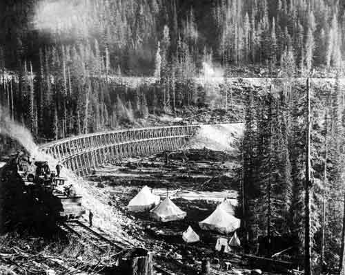 The dioramas and reconstructions stood out the most dramatically. A group of local volunteer model railroaders, for example, spent thousands of hours to recreate the appearance of the end-of-track during the construction across the prairies in 1883. Similarly, in an adjoining gallery the scale reconstruction of the completed Stoney Creek Bridge as it looked in July 1886 was outstanding. At more than eighty-five metres, this structure, located east of the summit of the Rogers Pass, was then the highest wooden bridge in the world.