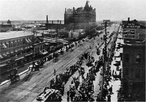 Main Street, south of Portage Avenue, 5 September 1897. The Manitoba Hotel is in the background.