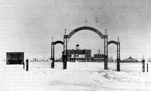 The orphanage and front gate in the 1930s. Words on gate, left to right, read “Asile Ritchot” éricorde, and “Infants’ Home.”