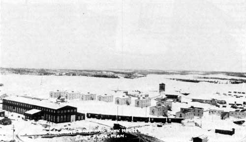 The original appearance of the community was very much typical of the temporary town site phenomenon. Designed to meet the immediate needs of the construction workers and cited as a “drill camp,” the early configuration of the town site followed no specific lines of development and in general reflected the rudimentary nature of the frontier. [33] Prevailing from 1927-1928, the drill camp was mostly composed of tents and primitive log structures. When, in 1928, the Sherritt Gordon Company committed itself to the development of the ore body, it also undertook to regulate town site affairs. This in effect concluded the era of the temporary town site and foreshadowed the greater participation of the company in town site development.